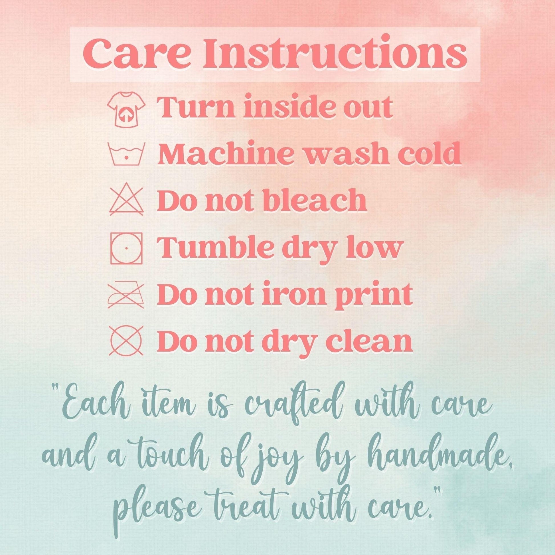 To preserve the vibrant print, we recommend washing inside out in cold water on a gentle cycle. For optimal care, tumble dry low or air dry. Avoid using fabric softener or bleach, and it's best not to iron directly on the design.