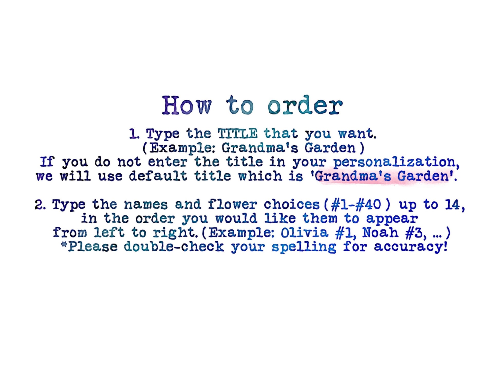 Input the TITLE that you want, your grandkids' names, and their choice of flowers in the personalization textbox. List the names in the order you would like them to appear from left to right. Then, place your order.