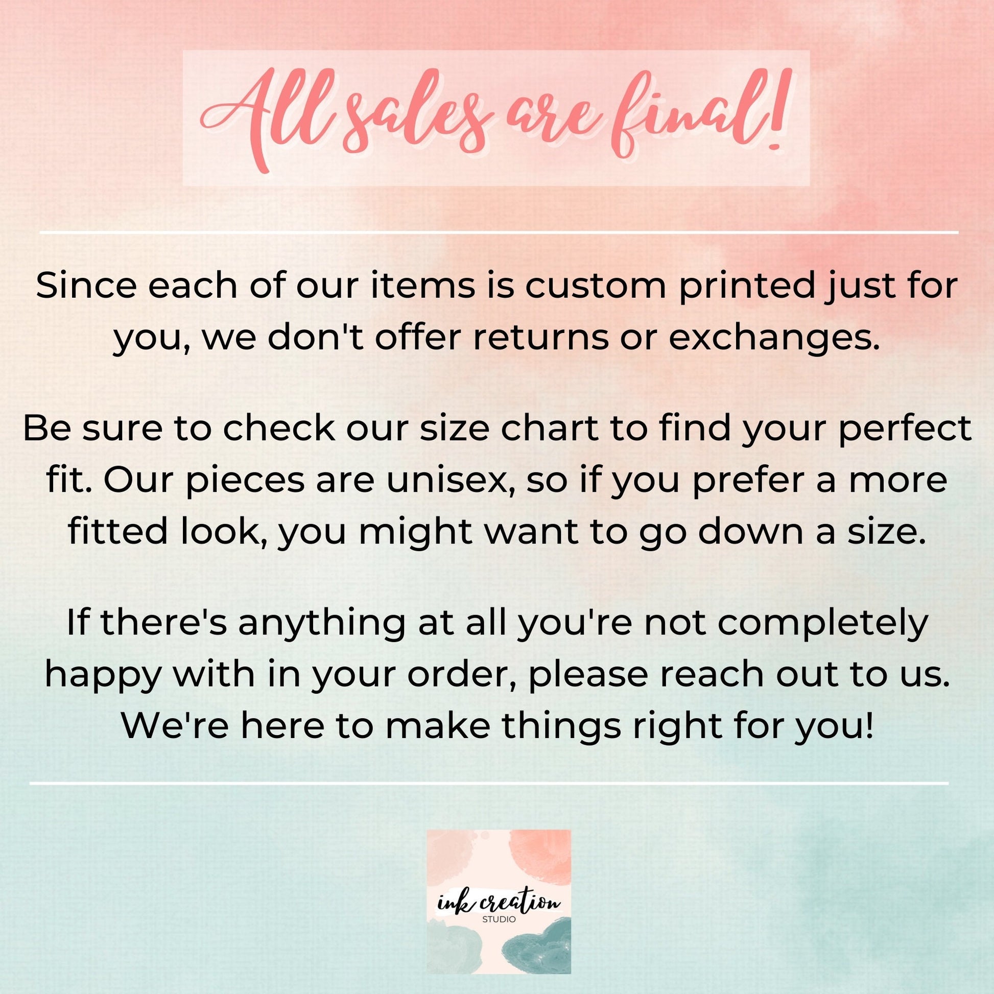 Because each sweatshirt is custom printed, we cannot accept returns or exchanges based on size. However, if there are any issues with your order, please contact us, and we'll quickly resolve them for you.